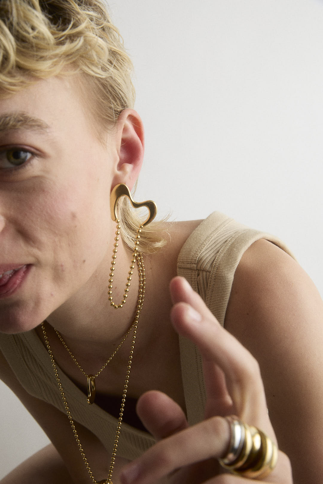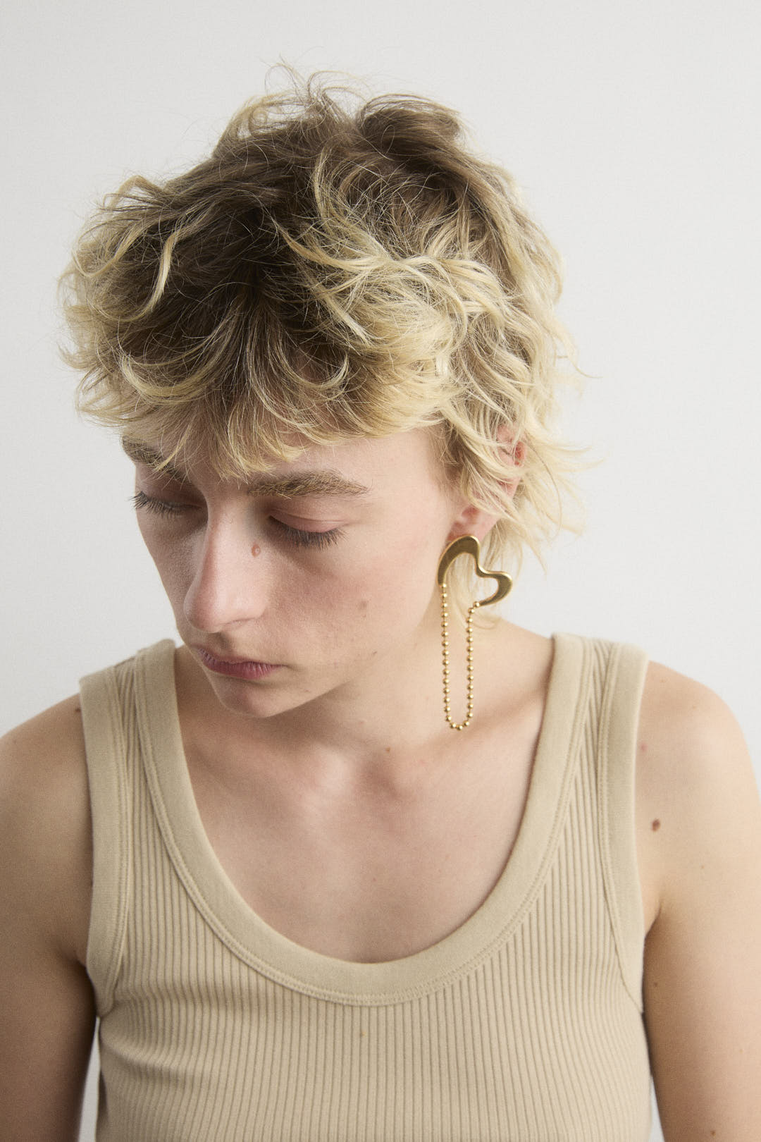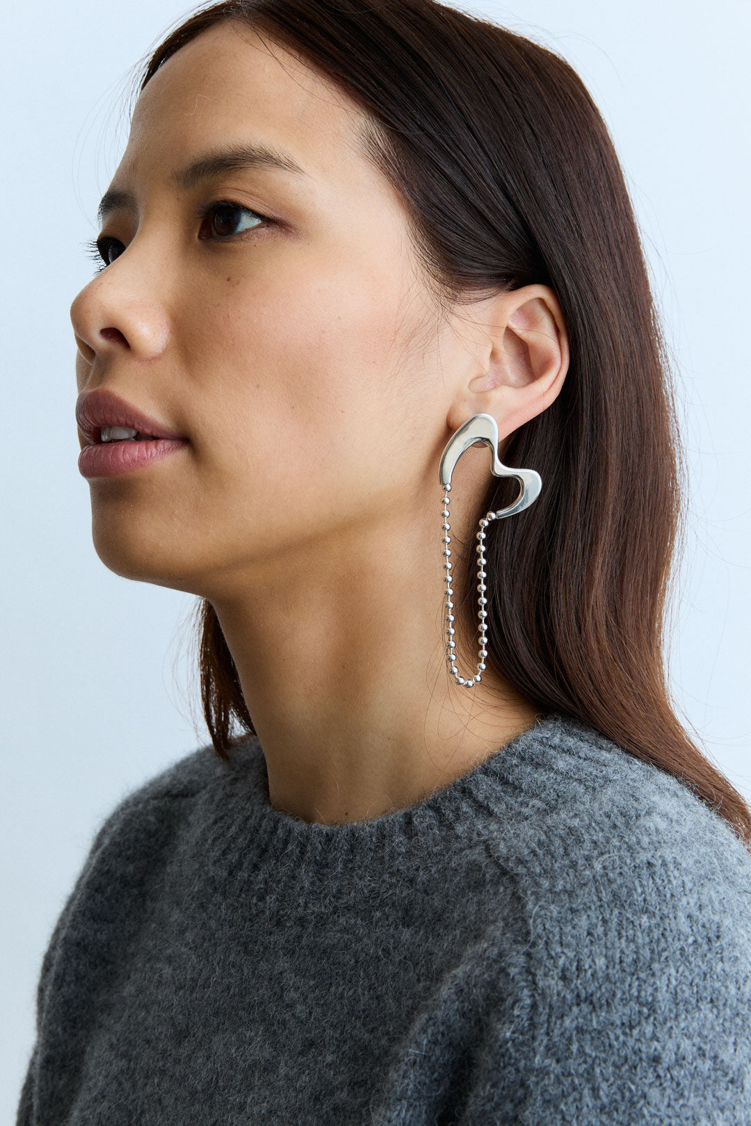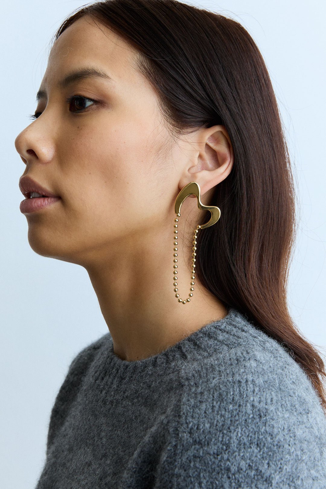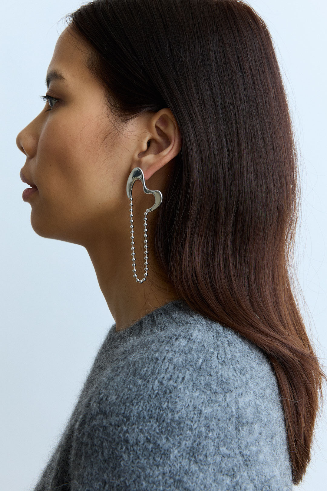Organic earring composed of a fixed part and ball chain pending.